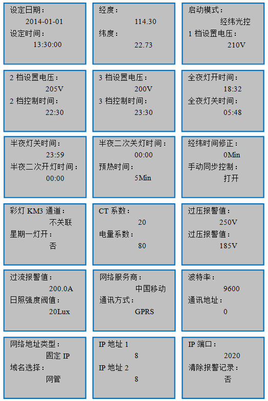 參數(shù)設置說明:按Enter進入“參數(shù)設置”,再按Enter進入驗證密碼:000001,進入?yún)?shù)設定界面,如需設置時間:把光標移到“設定時間”上,按Enter,光標閃爍,這時可以按上下左右鍵設定時間,設定后按Enter確認,按Esc退出。注:當啟動模式選用經(jīng)緯光控時,光控優(yōu)先起動,系統(tǒng)會自動生成每天的開關燈時間,開關燈時間不能直接調整,應通過“經(jīng)緯時間修正”來修改開關燈時間,-為時間提前, +為時間滯后。