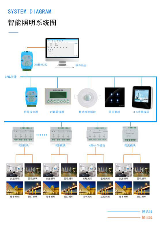 二、中間可添加面板控制或需要控制的產(chǎn)品和功能,CAN-BUS系統(tǒng)中可添加調(diào)光模塊、人體紅外、煙感雷達等感應(yīng)產(chǎn)品。拓展功能性強,系統(tǒng)控制靈活方便。