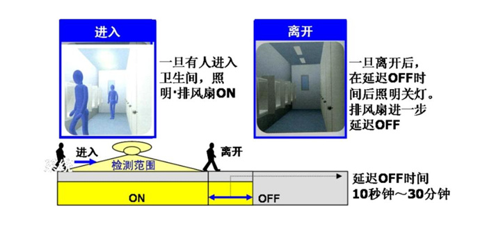 衛(wèi)生間內(nèi)置2盞燈,其中一盞為常亮燈,可采用開關(guān)面板控制。另外一盞采用移動(dòng)探測模塊控制、開關(guān)面板控制,達(dá)到人來燈亮,人走燈滅(可設(shè)置延時(shí)滅燈)的效果。這樣避免了衛(wèi)生間內(nèi)燈光常亮帶來不必要的能耗。