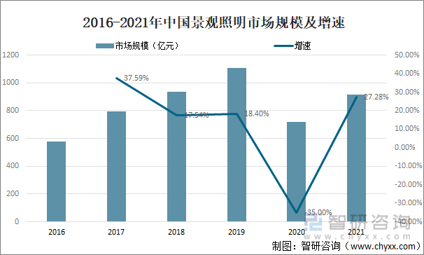 中國(guó)景觀照明行業(yè)發(fā)展較為迅速。近幾年受新冠疫情影響,2021年中國(guó)景觀照明市場(chǎng)規(guī)模為916.5億元,同比增長(zhǎng)27.28%;但隨后由于不少地方政府出臺(tái)相關(guān)政策有力促進(jìn)了景觀照明市場(chǎng)發(fā)展。