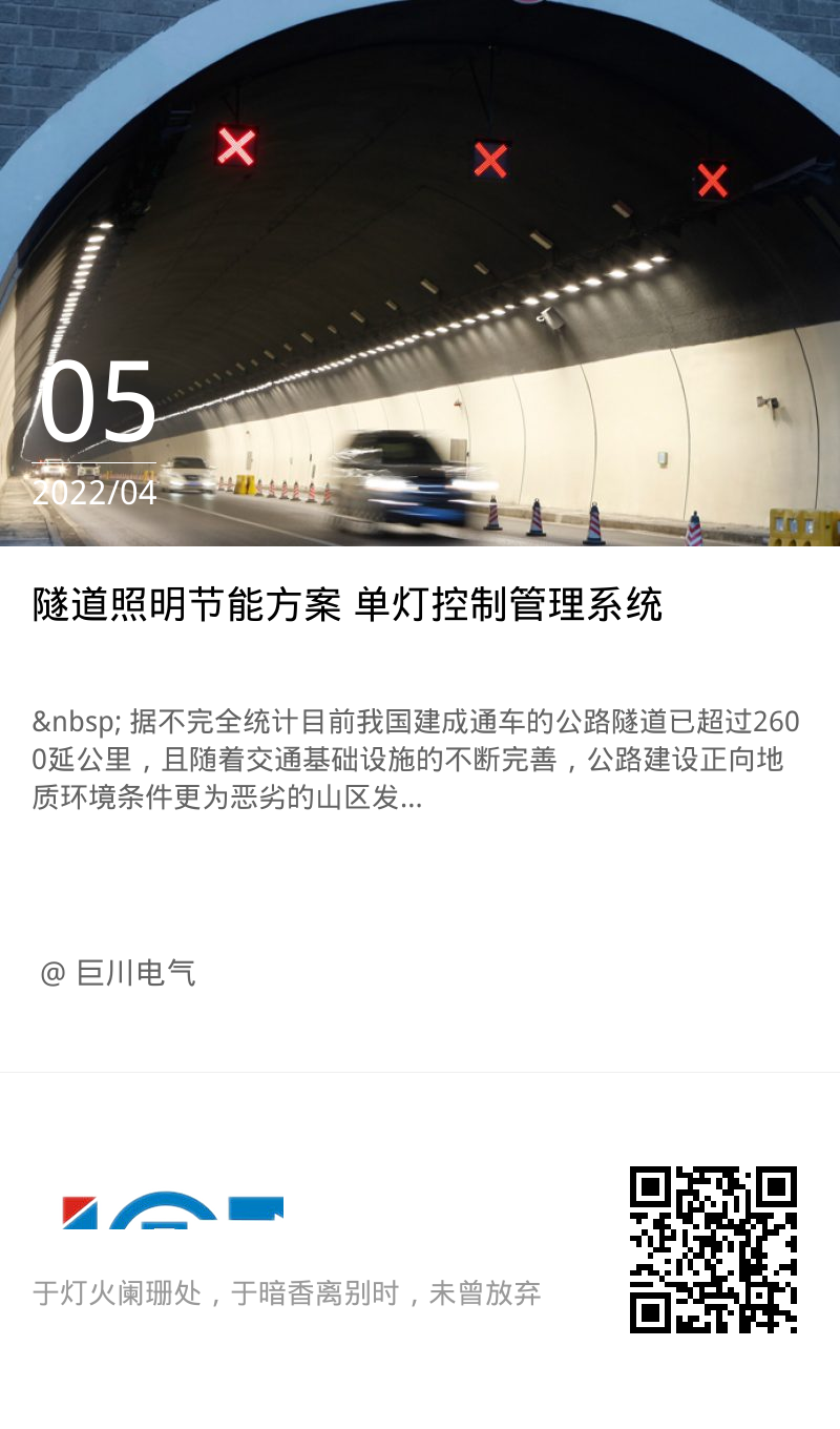 節(jié)能降耗、保障安全是建設(shè)和運(yùn)營(yíng)單位迫切需要解決的技術(shù)難題。巨川電氣科技隧道單燈智能照明控制系統(tǒng)可以節(jié)省電量的損耗,同時(shí)改善隧道內(nèi)視覺(jué)享受,減輕駕駛員疲勞,有利于提高隧道通行能力保證交通安全。