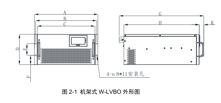 W-LVBO 系列產(chǎn)品根據(jù)安裝方式可分為機架式和壁掛式,二者外形尺寸標注示意如圖 2-1、2-2。產(chǎn)品覆蓋 50A~150A,按照功率等級的大小有三種不同尺寸機箱,具體外形安裝尺寸見表 2-2。