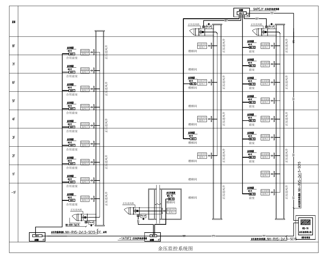 2.對(duì)于前室、合用前室,由于余壓控制區(qū)域?yàn)槎鄠€(gè)上下不貫通的空間(每層前室),需要在每層前室設(shè)WSI余壓傳感器,余壓傳感器的探測點(diǎn)一側(cè)于前室,另一側(cè)設(shè)于走道,余壓設(shè)定值為25-30Pa,當(dāng)系統(tǒng)控制區(qū)域超壓時(shí),WSI余壓傳感器發(fā)出報(bào)警信息,余壓控制器聯(lián)動(dòng)控制泄壓閥執(zhí)行器,根據(jù)實(shí)際余壓值與設(shè)定值的差異調(diào)節(jié)泄壓閥,以保證前室正壓設(shè)定值。